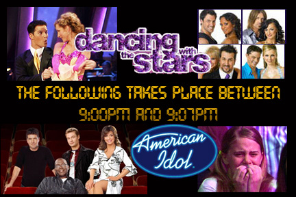 To be honest with you, I think we need to step back and look past the symbolic ramifications of this scheduling. Because, really, that’s all there is. While FOX is clearly posturing for media attention, let’s remember that, uh, nothing happens in the first seven minutes of a results show. For people interested in tuning in to see who gets eliminated on Dancing with the Stars, that first seven minutes will likely contain little but a recap, maybe an opening group number, perhaps some bad jokes from Tom Bergeron…nothing to really be too worried about. The conflict between these two shows will have little impact on viewing habits. I would wager that anyone who would have changed the channel at 9pm will likely do the same at 9:07 after watching Idol.