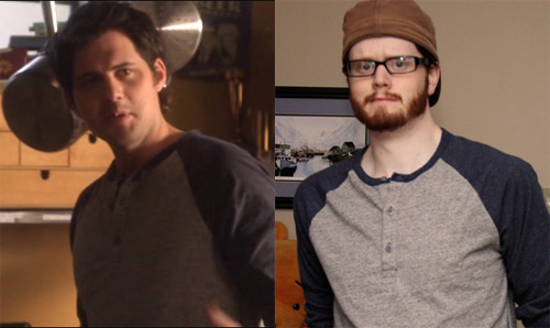 • Since Fienberg asked for it, I figure I have to prove my Twitter claim that I was wearing the same shirt that Baze wore the morning of the road trip today. As such, below you’ll find a nice comparison image: I have no romantic notions of winning the “Who Wore It Better?” Poll. I also included a random piece of slightly obscured childhood memorabilia, as I currently occupy my childhood bedroom, so see if you can figure out what it is.