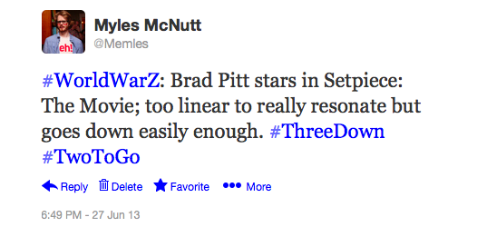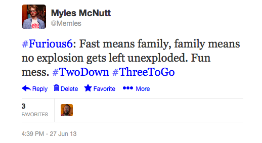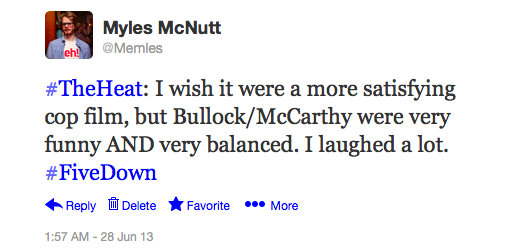 When I left each movie, I sent a quick 140-character tweet with my reaction to the film (which have been scattered throughout the post). They tend to match up with the above impressions (I’m probably a bit higher on Monsters University than I was initially), as years of immediately writing about TV shows I watch has conditioned me to be quick with formulating impressions. Those tweets proved to be useful anchors in thinking about these movies, as it attempts to retain them as individual films rather than the overlapping experience they were. At the same time, though, I feel the films take on greater meaning as part of that overlapping experience. It’s likely I’ll revisit at least a few of these films in other contexts and find nuance I didn’t before, but my experience with The Heat was enriched—critics of the film could argue skewed—as a welcome dose of comedy shared with the friends who came willing to drive me home, proving a perfect end to the day. It’s not the way I’d want to see every movie, but it’s a fine way to create a memorable day of cultural participation.
