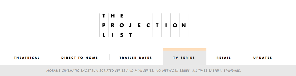 “The Projection List is not a network television guide. Not only are cable mini-series and short-run series traditionally more cinematic in nature, they are also much easier to track. Most cable season orders (the number of episodes ordered for any given season) are announced in-full, in advance of each season, whereas the vast majority of network series usually aren’t given a final season order until later in the season (if they aren’t outright cancelled in the middle of a season), thus making the tracking of network shows somewhat more challenging. For a more comprehensive network television guide, see TV.com.”