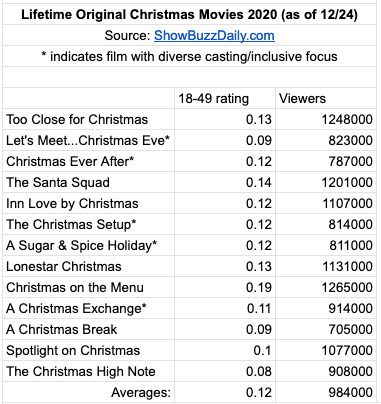 It’s unclear what that future holds for the Queer Cable Christmas Movie. Per the chart above, The Christmas Setup drew an audience comparable in size to the channel’s other “inclusive” Christmas offerings (which also include films with African-American leads and, in the case of Christmas Ever Again, Tony winner Ali Stroker as the first Cable Christmas lead with a disability), while Dashing in December drew decent if unspectacular viewership across at least two channels of its simulcast debut across four of Viacom’s cable properties (Paramount, TV Land, Pop, and Logo). Does Paramount see queer audiences as a continued target for Paramount Movie Network’s 2021 lineup of Christmas Movies, or was this a one-off experiment? Is Lifetime going to continue hunting for “firsts” and embrace the intersectionality of a diverse queer romance, or exploring the other parts of LGBTQ+? And was Hallmark happy enough with The Christmas House’s ratings performance and the pats on the back they received for its queer “B Story” enough to greenlight something where a same-sex relationship is worthy of the “A Story?”