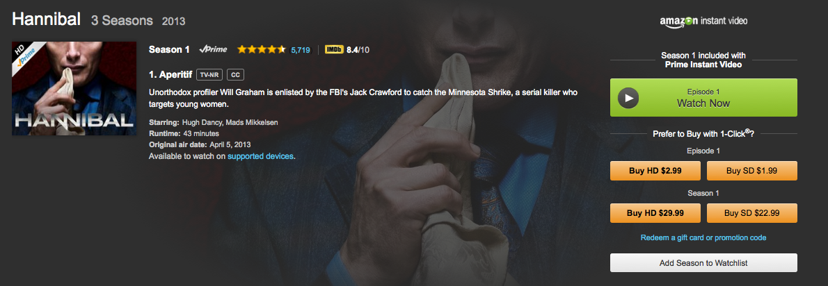 Well, okay, that’s maybe a bit confusing. NBC did in fact announce that Season 3 would be the end of the show’s run on the network, following a slide from “problematic” to “abysmal” demographic ratings this summer. But while the rhetoric of cancellation was perhaps logically used to describe this decision, the simple fact is that NBC does not have the authority to cancel Hannibal. They are, in this case, one licensee of an international co-production, who Entertainment Weekly has revealed is paying only $185,000—this is absurdly low for a broadcast series, even in summer—in order to air season three of the show produced by Gaumont International Television. And so what’s really happening here is that Gaumont and its other producing partners—including Sony Pictures Television, who distributes the series and co-produces through its AXN international cable network—are losing their U.S. distributor. [I talked a little bit more about this in a Periscope broadcast you can watch if you’re more connected to nascent social media platforms than I am]