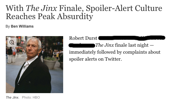 “The key difference here is that The Jinx isn’t fiction. It is a docu-drama about a real man who is very probably a murderer multiple times over and whose cases have been covered in the media for decades. When a famous murder suspect all but confesses, it is news, and the fact that the confession happened within the confines of a television show does not mean that that news becomes subject to the same etiquette as the latest Game of Thrones killing. Because that’s fiction, and it doesn’t really matter.”