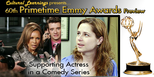 Chenoweth and Krakowski have the exact opposite problem, really. In Krakowski’s case, I don’t think she had the same kind of strong material this year (when she and her co-stars picked up on the 30 Rock Emmy train with supporting nods) as she did last, with her fat period providing a lot of great comic material overall. Jenna was a bit more all over the place this season, but on a show with that much buzz it might not matter. Chenoweth’s Olive Snook, meanwhile, was in fine form on Pushing Daisies, in the midst of deeply personal but hilarious storylines played out in the show’s trademark zany and surrealistic environment. However, no one watched Pushing Daisies, and for all of her Tony-winning brilliance the cancelled show factor could weight heavily on her ability to win the award.